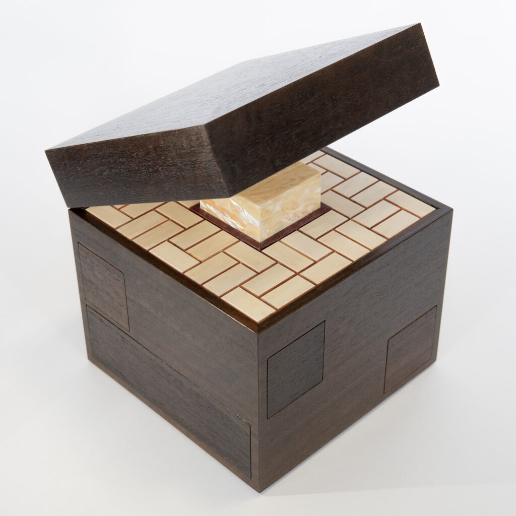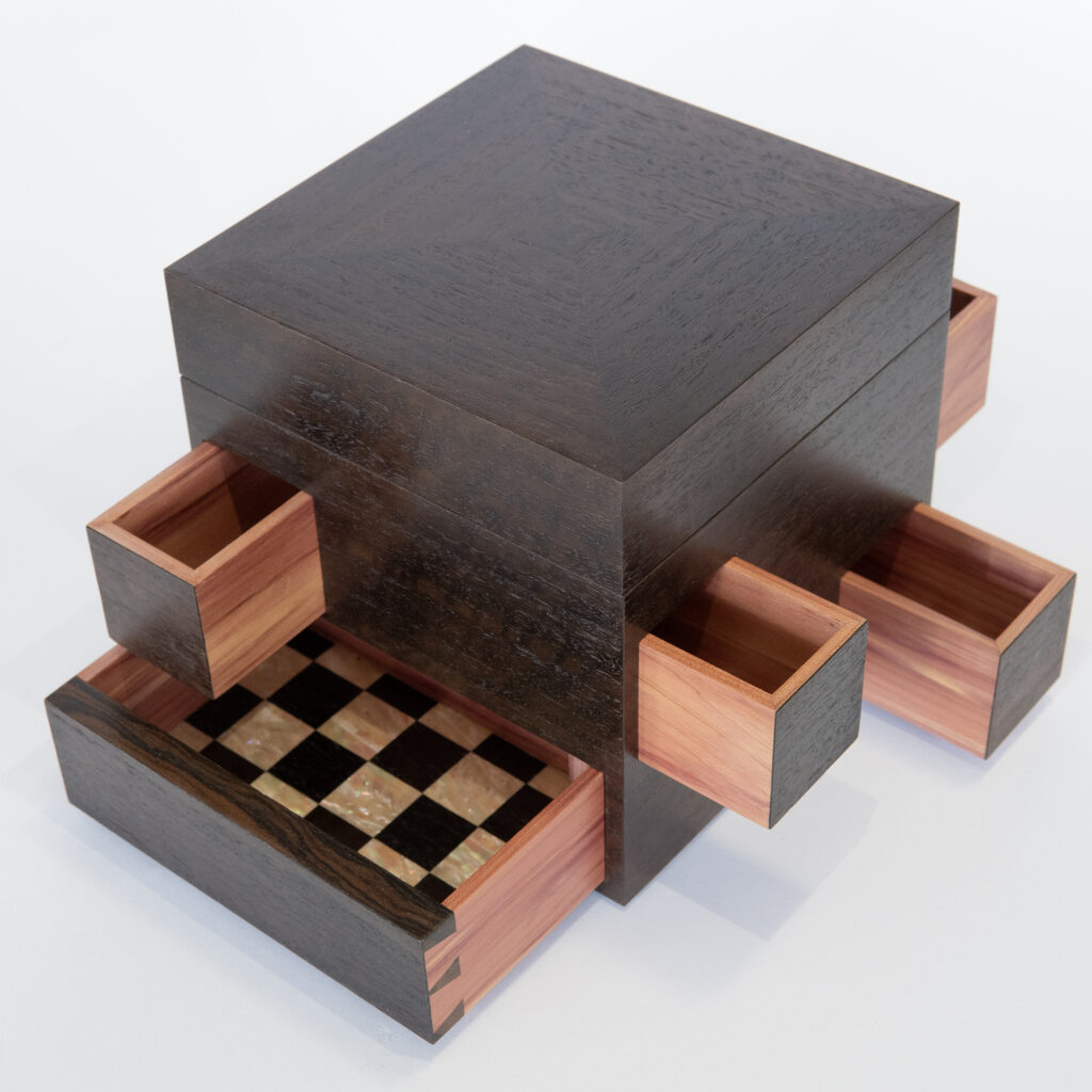 Materials: Birch plywood (internal structure), walnut (solid and veneer), various dyed veneers, ebony, Elforyn, brass.